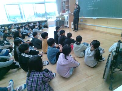 校長から、基礎期(1〜4年生)に向けて「元気な挨拶をしよう」、充実期(5〜7年生)に向けて「学校をきれいにしよう」、発展期(8〜9年生)に向けて「誇れる学校をつくろう」という話をしました。